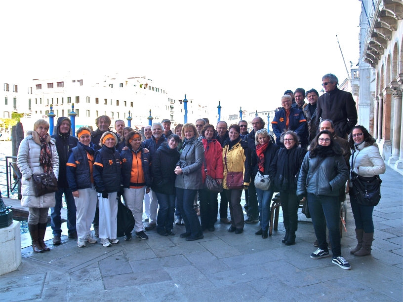 Il giorno 12 novembre, percorrendo il Canal Grande su tre ‘caorline’ messe a disposizione dall’Associazione “Voga Veneta”, i due gruppi si sono recati a Ca’ Farsetti dove sono stati ricevuti dal vice Sindaco Sandro Simionato, dal Consigliere comunale Gabriele Scaramuzza e dal Consigliere provinciale Lionello Pellizzer. Lì, oltre al consueto scambio di omaggi e di complimenti, i nostri amici si sono potuti finalmente affacciare su un terrazzo che dà sul Canal Grande: crediamo che immagine migliore della nostra città e del nostro incontro non potevano riportare ritornando nei loro Comuni .